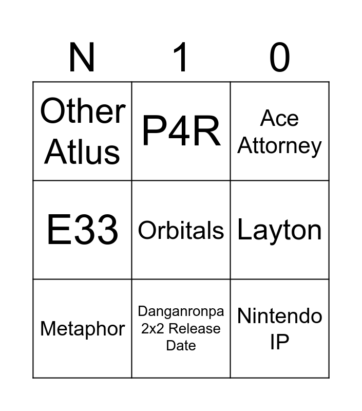 This bingo card has a free space and 8 words: Layton, Ace Attorney, P4R, Metaphor, Other Atlus, Nintendo IP, E33 and Danganronpa 2x2 Release Date.