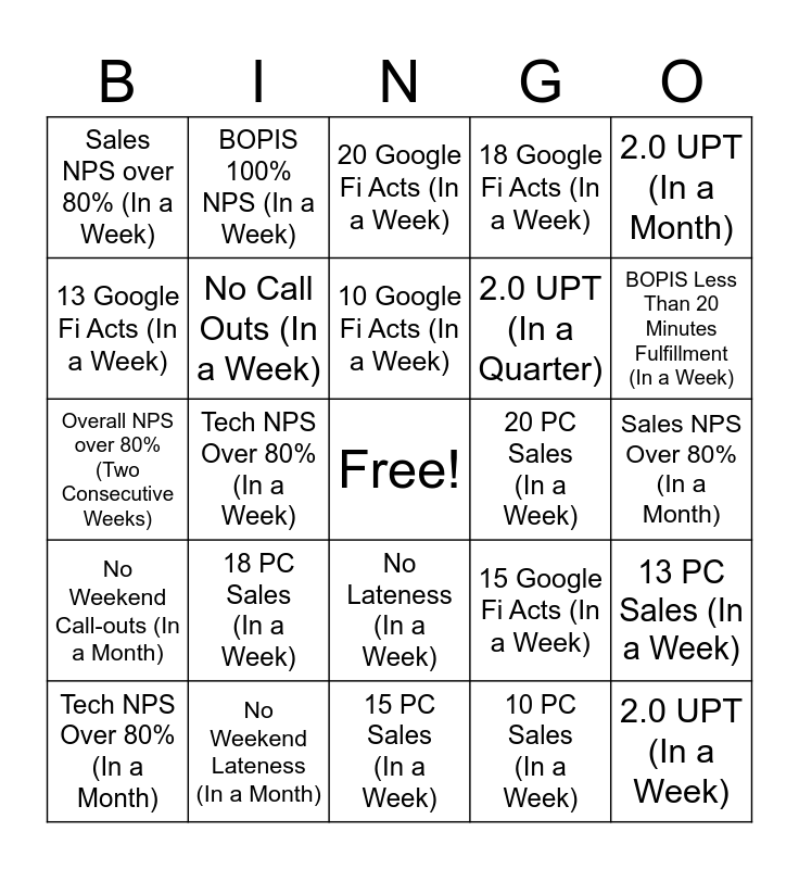 This bingo card has a free space and 24 words: 18 PC Sales (In a Week), No Weekend Lateness (In a Month), 10 Google Fi Acts (In a Week), Tech NPS Over 80% (In a Month), 2.0 UPT (In a Month), Sales NPS over 80% (In a Week), 13 Google Fi Acts (In a Week), BOPIS 100% NPS (In a Week), 20 PC Sales (In a Week), No Lateness (In a Week), 2.0 UPT (In a Quarter), Overall NPS over 80% (Two Consecutive Weeks), 15 Google Fi Acts (In a Week), 13 PC Sales (In a Week), No Call Outs (In a Week), 10 PC Sales (In a Week), Sales NPS Over 80% (In a Month), 20 Google Fi Acts (In a Week), BOPIS Less Than 20 Minutes Fulfillment (In a Week), Tech NPS Over 80% (In a Week), 2.0 UPT (In a Week), No Weekend Call-outs (In a Month), 18 Google Fi Acts (In a Week) and 15 PC Sales (In a Week).