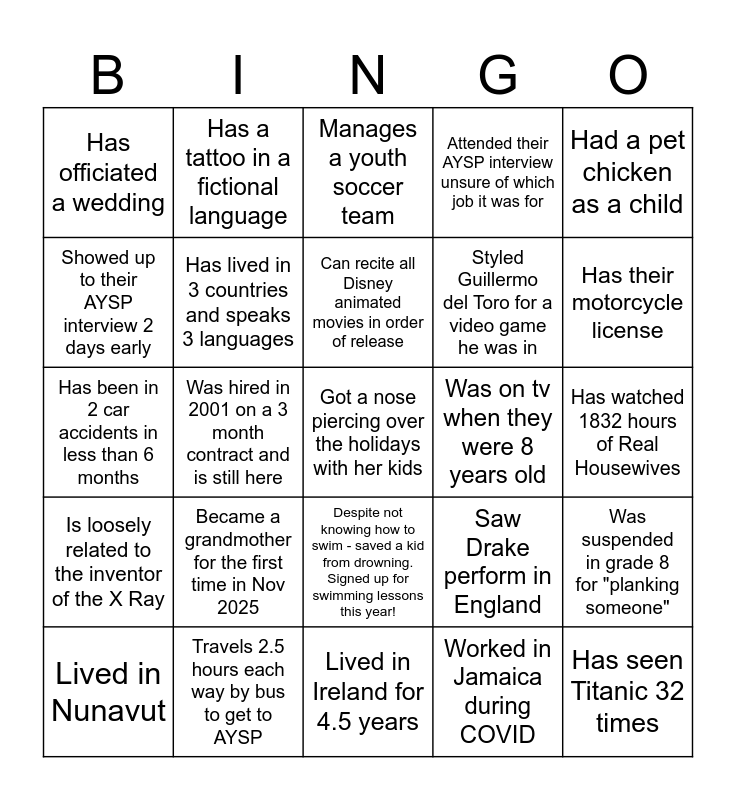 This bingo card has a free space and 24 words: Became a grandmother for the first time in Nov 2025, Travels 2.5 hours each way by bus to get to AYSP, Can recite all Disney animated movies in order of release, Lived in Nunavut, Had a pet chicken as a child, Has officiated a wedding, Showed up to their AYSP interview 2 days early, Has a tattoo in a fictional language, Was on tv when they were 8 years old, Despite not knowing how to swim - saved a kid from drowning. Signed up for swimming lessons this year!, Styled Guillermo del Toro for a video game he was in, Has been in 2 car accidents in less than 6 months, Saw Drake perform in England, Was suspended in grade 8 for "planking someone", Has lived in 3 countries and speaks 3 languages, Worked in Jamaica during COVID, Has watched 1832 hours of Real Housewives, Manages a youth soccer team, Has their motorcycle license, Was hired in 2001 on a 3 month contract and is still here, Has seen Titanic 32 times, Is loosely related to the inventor of the X Ray, Attended their AYSP interview unsure of which job it was for and Lived in Ireland for 4.5 years.