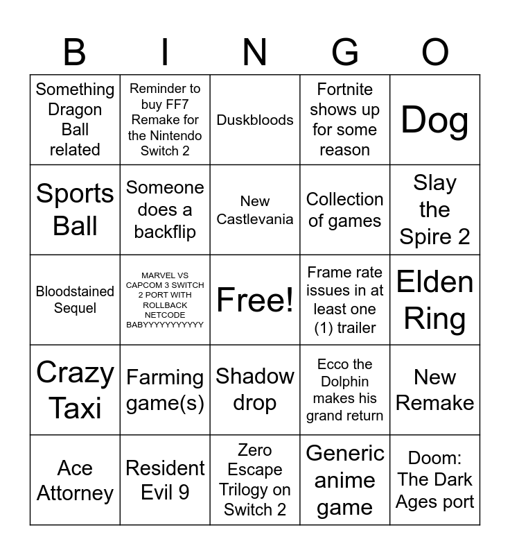 This bingo card has a free space and 24 words: Farming game(s), Resident Evil 9, New Castlevania, Ace Attorney, Dog, Something Dragon Ball related, Sports Ball, Reminder to buy FF7 Remake for the Nintendo Switch 2, Frame rate issues in at least one (1) trailer, Shadow drop, Collection of games, Bloodstained Sequel, Ecco the Dolphin makes his grand return, New Remake, Someone does a backflip, Generic anime game, Elden Ring, Duskbloods, Slay the Spire 2, MARVEL VS CAPCOM 3 SWITCH 2 PORT WITH ROLLBACK NETCODE BABYYYYYYYYYYY, Doom: The Dark Ages port, Crazy Taxi, Fortnite shows up for some reason and Zero Escape Trilogy on Switch 2.