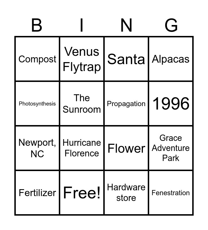 This bingo card has 16 words: Free!, Grace Adventure Park, Santa, Compost, Newport, NC, Venus Flytrap, Flower, Hardware store, Photosynthesis, The Sunroom, Fertilizer, Alpacas, Hurricane Florence, 1996, Propagation and Fenestration.