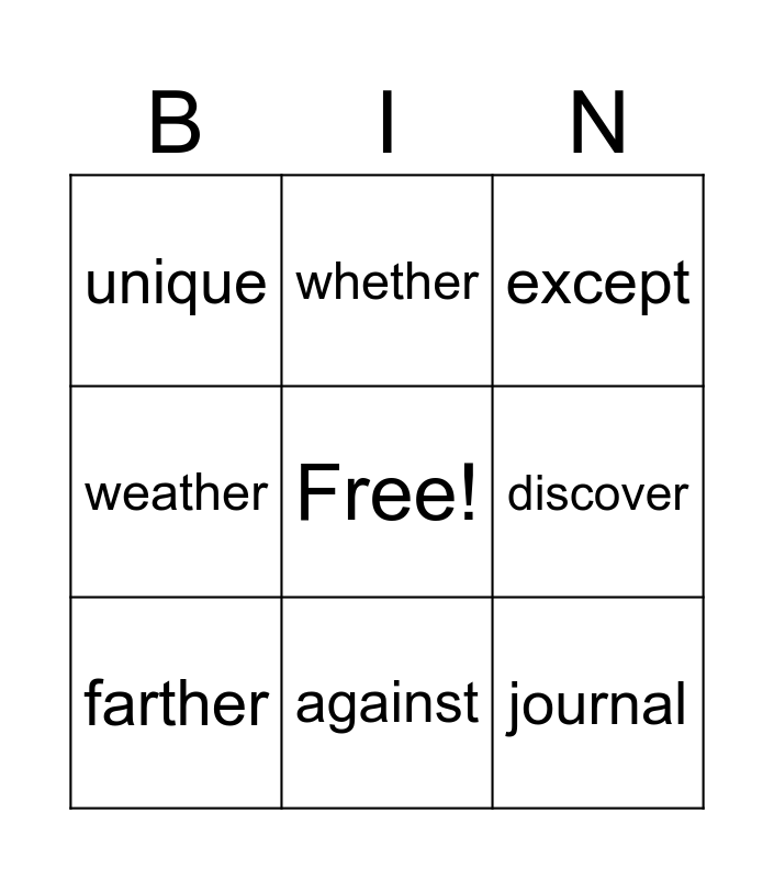 This bingo card has a free space and 14 words: afarid, responsible, farther, whether, weather, journal, leave, general, against, unique, especially, discover, except and whole.