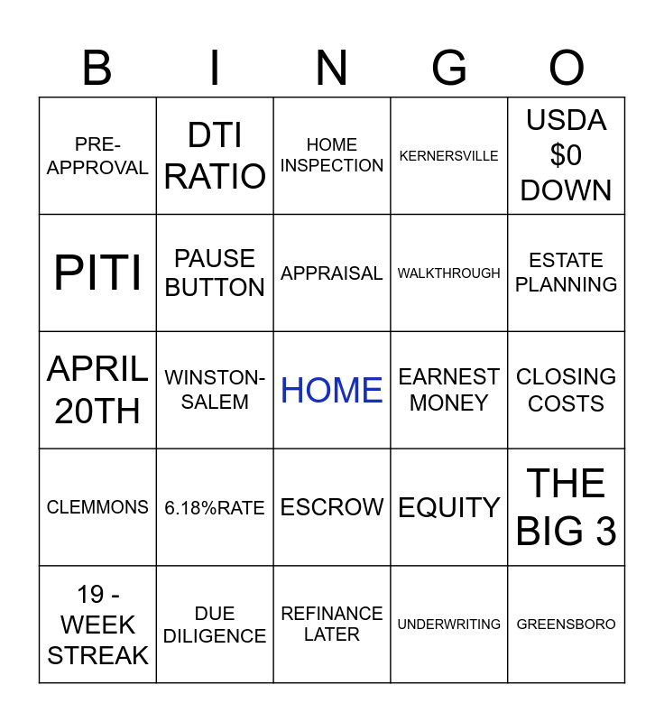 This bingo card has a free space and 24 words: 6.18%RATE, DUE DILIGENCE, APPRAISAL, 19 - WEEK STREAK, USDA $0 DOWN, PRE-APPROVAL, PITI, DTI RATIO, EARNEST MONEY, ESCROW, WALKTHROUGH, APRIL 20TH, EQUITY, THE BIG 3, PAUSE BUTTON, UNDERWRITING, CLOSING COSTS, HOME INSPECTION, ESTATE PLANNING, WINSTON-SALEM, GREENSBORO, CLEMMONS, KERNERSVILLE and REFINANCE LATER.
