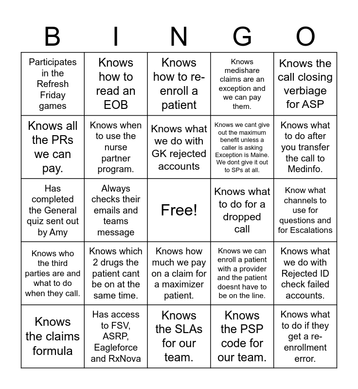 This bingo card has a free space and 29 words: Knows the claims formula, Uses the call guide for every call, Always checks their emails and teams message, Reads the newsletters, Participates in the Refresh Friday games, Knows how to re-enroll a patient, Knows when to use the nurse partner program., Knows which 2 drugs the patient cant be on at the same time., Knows what to do for a dropped call, Has access to FSV, ASRP, Eagleforce and RxNova, Know what channels to use for questions and for Escalations, Knows what to do if they get a re-enrollment error., Knows the SLAs for our team., Knows the PSP code for our team., Knows what to do after you transfer the call to Medinfo., Knows we dont change patient and provider type on admin and have leadership do it., Knows how much we pay on a claim for a maximizer patient., Knows who the third parties are and what to do when they call., Knows the call closing verbiage for ASP, Has completed the General quiz sent out by Amy, Knows we can enroll a patient with a provider and the patient doesnt have to be on the line., Knows what we do when someone says they are only enrolled in medicare., Knows we cant give out the maximum benefit unless a caller is asking Exception is Maine. We dont give it out to SPs at all., Knows all the PRs we can pay., Knows medishare claims are an exception and we can pay them., Knows how to read an EOB, Knows what we do with Rejected ID check failed accounts., Knows what we do with GK rejected accounts and Knows we have to take ownership of every call and Summarize/recap it at the end..