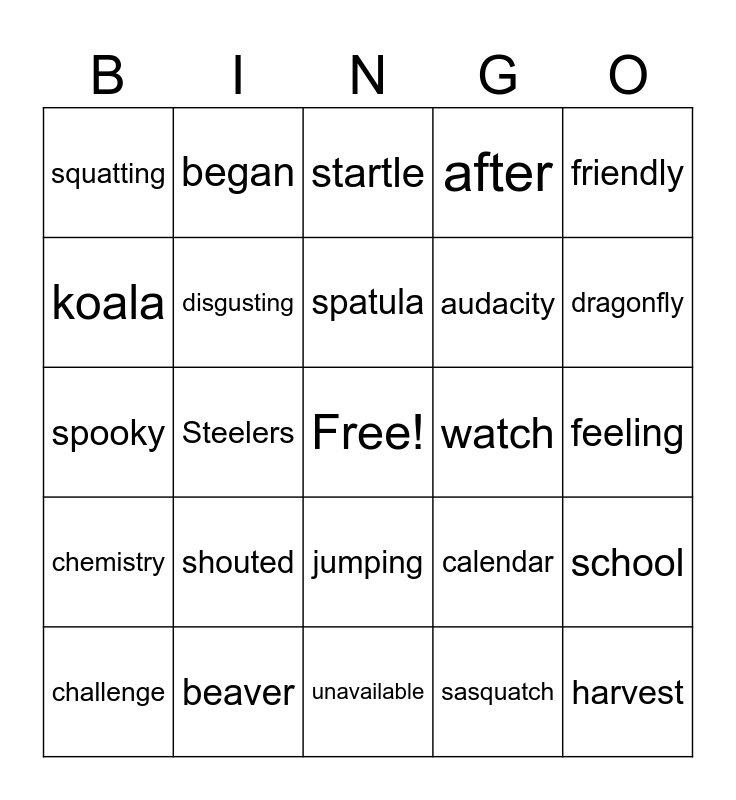 This bingo card has a free space and 35 words: three, happily, short, disgusting, jumping, after, koala, New Hampshire, spatula, Chevrolet, spooky, friendly, tarantula, radioactive, squatting, watch, sasquatch, Steelers, chemistry, harvest, calendar, challenge, school, beaver, startle, dragonfly, cheeseburger, backflip, audacity, feeling, quail, unavailable, shouted, began and readiness.