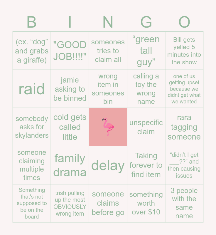 This bingo card has a free space and 24 words: family drama, trish pulling up the most OBVIOUSLY wrong item, wrong item in someones bin, Something that's not supposed to be on the board, Bill gets yelled 5 minutes into the show, (ex. “dog” and grabs a giraffe), raid, "GOOD JOB!!!!", unspecific claim, delay, calling a toy the wrong name, somebody asks for skylanders, Taking forever to find item, “didn’t I get ___??” and then causing issues, jamie asking to be binned, something worth over $10, rara tagging someone, someones tries to claim all, one of us getting upset because we didnt get what we wanted, cold gets called little, 3 people with the same name, someone claiming multiple times, “green tall guy” and someone claims before go.