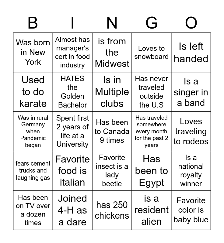 This bingo card has a free space and 24 words: Favorite food is italian, Joined 4-H as a dare, Is in Multiple clubs, Has been on TV over a dozen times, Is left handed, Was born in New York, Used to do karate, Almost has manager's cert in food industry, Has traveled somewhere every month for the past 2 years, Favorite insect is a lady beetle, Has never traveled outside the U.S, Was in rural Germany when Pandemic began, Has been to Egypt, Is a national royalty winner, HATES the Golden Bachelor, is a resident alien, Loves traveling to rodeos, is from the Midwest, Is a singer in a band, Spent first 2 years of life at a University, Favorite color is baby blue, fears cement trucks and laughing gas, Loves to snowboard and has 250 chickens.