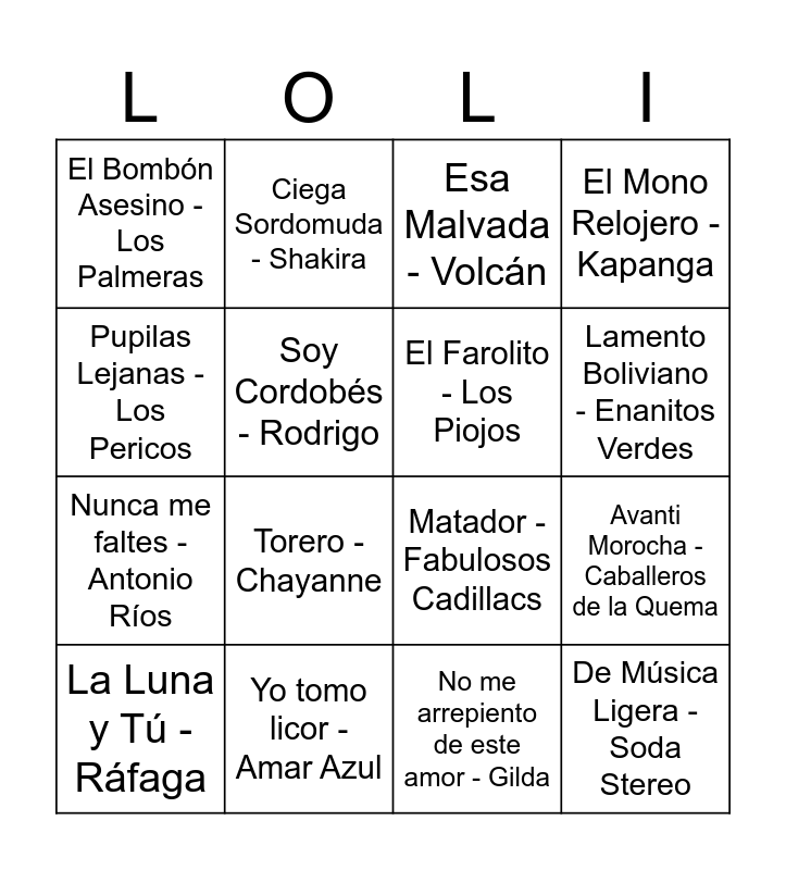 This bingo card has 40 words: La Guitarra - Auténticos Decadentes, Matador - Fabulosos Cadillacs, Auto Rojo - Vilma Palma, El Farolito - Los Piojos, Yo Tomo - Bersuit Vergarabat, Flaca - Andrés Calamaro, Lamento Boliviano - Enanitos Verdes, Loco un poco - Turf, Pupilas Lejanas - Los Pericos, De Música Ligera - Soda Stereo, Avanti Morocha - Caballeros de la Quema, El Mono Relojero - Kapanga, La Luna y Tú - Ráfaga, No me arrepiento de este amor - Gilda, Yo tomo licor - Amar Azul, La Ventanita - Grupo Sombras, Tonta - Commanche, El Bombón Asesino - Los Palmeras, Violeta - Alcides, Esa Malvada - Volcán, Se te ve la tanga - Damas Gratis, El embrujo - Los palmeras, Nunca me faltes - Antonio Ríos, Soy Cordobés - Rodrigo, Ocho Cuarenta - Rodrigo, Lo mejor del amor - Rodrigo, Beso a Beso - La Mona Jiménez, Por lo que yo te quiero - Walter Olmos, Olvídala - Banda XXI, Ahora te puedes marchar - Luis Miguel, Suave - Luis Miguel, Será que no me amas - Luis Miguel, Livin' la Vida Loca - Ricky Martin, Provócame - Chayanne, Torero - Chayanne, Azul - Cristian Castro, Lloviendo Estrellas - Cristian Castro, Color Esperanza - Diego Torres, Ciega Sordomuda - Shakira and Piel Morena - Thalia.