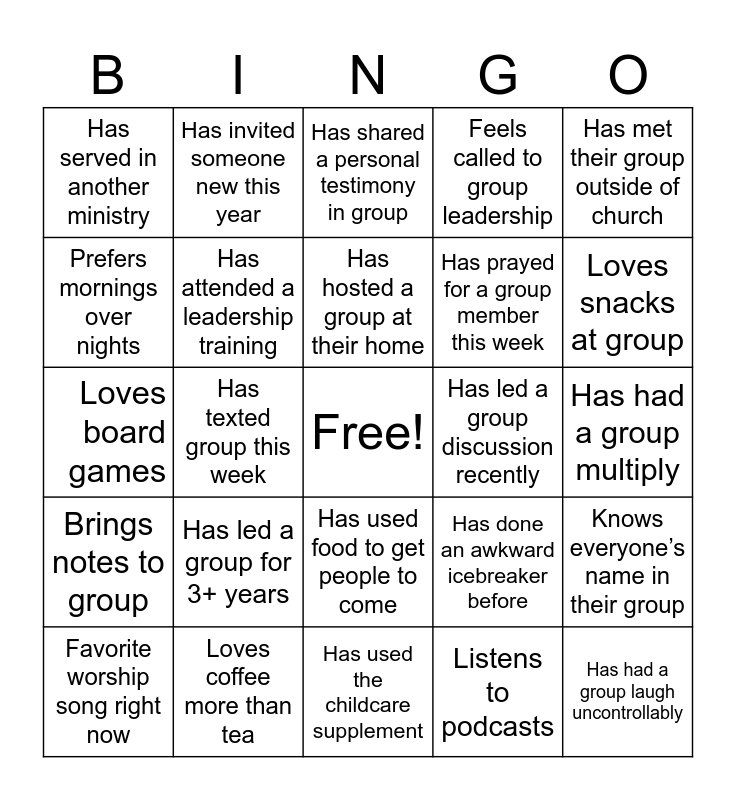 This bingo card has a free space and 24 words: Has led a group for 3+ years, Loves coffee more than tea, Has hosted a group at their home, Favorite worship song right now, Has met their group outside of church, Has served in another ministry, Prefers mornings over nights, Has invited someone new this year, Has led a group discussion recently, Has used food to get people to come, Has prayed for a group member this week, Loves board games, Has done an awkward icebreaker before, Knows everyone’s name in their group, Has attended a leadership training, Listens to podcasts, Has had a group multiply, Has shared a personal testimony in group, Loves snacks at group, Has texted group this week, Has had a group laugh uncontrollably, Brings notes to group, Feels called to group leadership and Has used the childcare supplement.