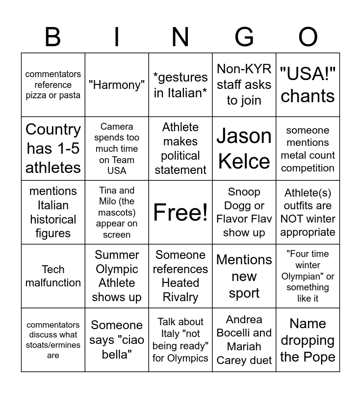 This bingo card has a free space and 24 words: Summer Olympic Athlete shows up, Someone says "ciao bella", Athlete makes political statement, commentators discuss what stoats/ermines are, "USA!" chants, commentators reference pizza or pasta, Country has 1-5 athletes, "Harmony", Snoop Dogg or Flavor Flav show up, Someone references Heated Rivalry, Jason Kelce, mentions Italian historical figures, Mentions new sport, "Four time winter Olympian" or something like it, Camera spends too much time on Team USA, Andrea Bocelli and Mariah Carey duet, Athlete(s) outfits are NOT winter appropriate, *gestures in Italian*, someone mentions metal count competition, Tina and Milo (the mascots) appear on screen, Name dropping the Pope, Tech malfunction, Non-KYR staff asks to join and Talk about Italy "not being ready" for Olympics.
