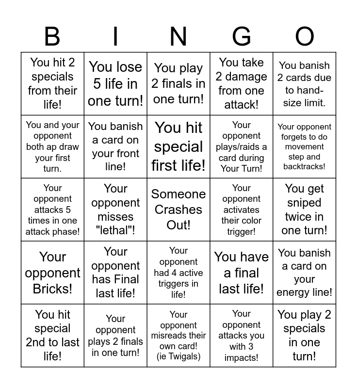 This bingo card has a free space and 24 words: Your opponent has Final last life!, Your opponent plays 2 finals in one turn!, You hit special first life!, You hit special 2nd to last life!, You banish 2 cards due to hand-size limit., You hit 2 specials from their life!, You and your opponent both ap draw your first turn., You lose 5 life in one turn!, Your opponent activates their color trigger!, Your opponent had 4 active triggers in life!, Your opponent plays/raids a card during Your Turn!, Your opponent attacks 5 times in one attack phase!, You have a final last life!, You banish a card on your energy line!, You banish a card on your front line!, Your opponent attacks you with 3 impacts!, You get sniped twice in one turn!, You play 2 finals in one turn!, Your opponent forgets to do movement step and backtracks!, Your opponent misses "lethal"!, You play 2 specials in one turn!, Your opponent Bricks!, You take 2 damage from one attack! and Your opponent misreads their own card! (ie Twigals).