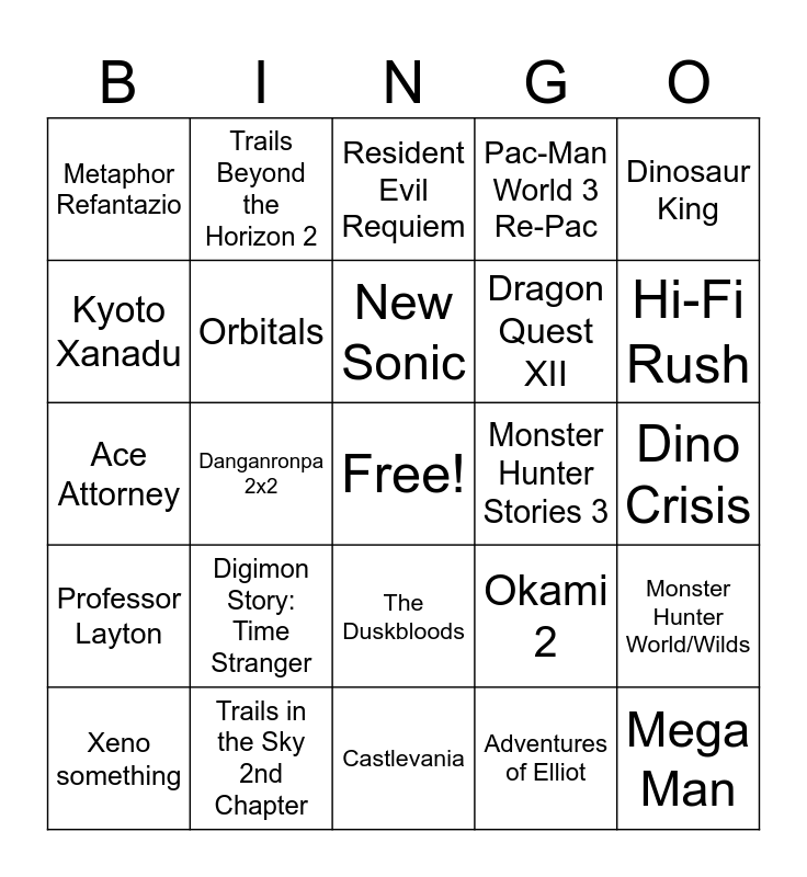 This bingo card has a free space and 24 words: Digimon Story: Time Stranger, Trails in the Sky 2nd Chapter, New Sonic, Xeno something, Dinosaur King, Metaphor Refantazio, Kyoto Xanadu, Trails Beyond the Horizon 2, Monster Hunter Stories 3, The Duskbloods, Dragon Quest XII, Ace Attorney, Okami 2, Monster Hunter World/Wilds, Orbitals, Adventures of Elliot, Dino Crisis, Resident Evil Requiem, Hi-Fi Rush, Danganronpa 2x2, Mega Man, Professor Layton, Pac-Man World 3 Re-Pac and Castlevania.