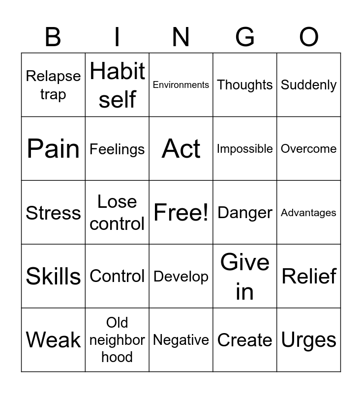 This bingo card has a free space and 46 words: Triggers, Urges, Situations, Negative, Control, Trouble, Habit self, Powerful events, Pain, Remember, Feelings, Thoughts, Relief, Give in, Strong, Bored, Act, Danger, Slowly, Suddenly, Lose control, Create, Relapse trap, Impossible, Escape, Overcome, Weak, Inner self, Develop, Skills, Recovery, Avoid, Old friends, Substances, Betting, Old neighbor hood, Advantages, Plan, Forecasting, Danger spotting, Think ahead, Environments, Stress, Rebuild, Learn and Safety.