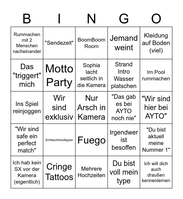 This bingo card has 25 words: Schlauchbootlippen, Mehrere Hochzeiten, Sophia lacht seitlich in die Kamera, Ich hab kein SX vor der Kamera (eigentlich), Kleidung auf Boden (viel), Rummachen mit 2 Menschen nacheinander, Das "triggert" mich, "Sendezeit", "Das gab es bei AYTO noch nie", Fuego, Strand Intro Wasser platschen, Ins Spiel reinjoggen, Irgendwer ist besoffen, "Du bist aktuell meine Nummer 1", Motto Party, Ich will dich auch draußen kennenlernen, "Wir sind hier bei AYTO", BoomBoom Room, Im Pool rummachen, Wir sind exklusiv, Nur Arsch in Kamera, Cringe Tattoos, "Wir sind safe ein perfect match", Jemand weint and Du bist voll mein type.