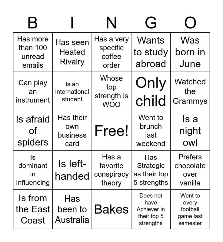 This bingo card has a free space and 24 words: Is left-handed, Has been to Australia, Whose top strength is WOO, Is from the East Coast, Was born in June, Has more than 100 unread emails, Can play an instrument, Has seen Heated Rivalry, Went to brunch last weekend, Has a favorite conspiracy theory, Only child, Is afraid of spiders, Has Strategic as their top 5 strengths, Prefers chocolate over vanilla, Is an international student, Does not have Achiever in their top 5 strengths, Is a night owl, Has a very specific coffee order, Watched the Grammys, Has their own business card, Went to every football game last semester, Is dominant in Influencing, Wants to study abroad and Bakes.