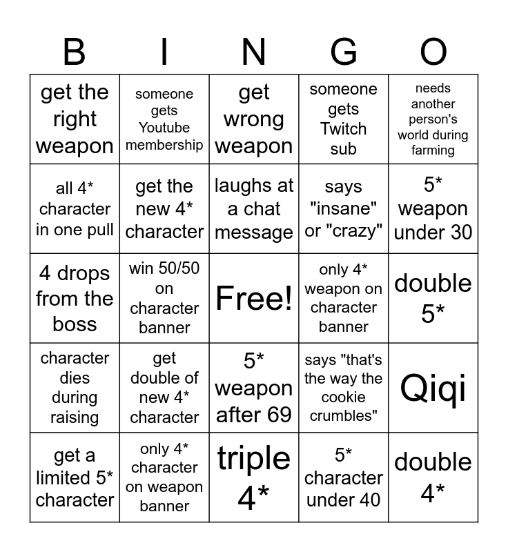 This bingo card has a free space and 29 words: get a limited 5* character, get a standard 5* character, win 50/50 on character banner, loose 50/50 on character banner, get the right weapon, get wrong weapon, get the new 4* character, get double of new 4* character, only 4* weapon on character banner, only 4* character on weapon banner, double 5*, double 4*, triple 4*, 5* character under 40, 5* weapon under 30, 5* character after 79, 5* weapon after 69, character dies during raising, needs another person's world during farming, 4 drops from the boss, says "that's the way the cookie crumbles", says "it is what it is", says "insane" or "crazy", all 4* character in one pull, someone gets Twitch sub, someone gets Youtube membership, Qiqi, laughs at a chat message and forgets to "beep" during farming.