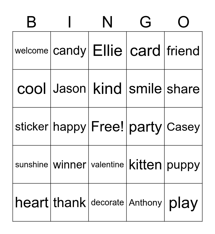 This bingo card has a free space and 24 words: winner, thank, kind, heart, friend, welcome, cool, candy, party, valentine, smile, sticker, kitten, puppy, Jason, Anthony, Casey, Ellie, share, happy, play, sunshine, card and decorate.