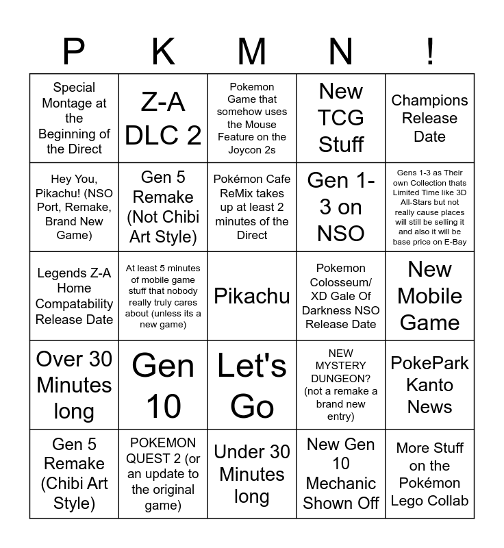 This bingo card has a free space and 25 words: Gen 10, Under 30 Minutes long, Pokémon Cafe ReMix takes up at least 2 minutes of the Direct, Gen 5 Remake (Chibi Art Style), Champions Release Date, Special Montage at the Beginning of the Direct, Hey You, Pikachu! (NSO Port, Remake, Brand New Game), Z-A DLC 2, Pokemon Colosseum/ XD Gale Of Darkness NSO Release Date, Let's Go, Gen 1-3 on NSO, Legends Z-A Home Compatability Release Date, NEW MYSTERY DUNGEON? (not a remake a brand new entry), PokePark Kanto News, Gen 5 Remake (Not Chibi Art Style), A Section Dedicated to Pokémon Champions, New Mobile Game, Pokemon Game that somehow uses the Mouse Feature on the Joycon 2s, Gens 1-3 as Their own Collection thats Limited Time like 3D All-Stars but not really cause places will still be selling it and also it will be base price on E-Bay, At least 5 minutes of mobile game stuff that nobody really truly cares about (unless its a new game), More Stuff on the Pokémon Lego Collab, POKEMON QUEST 2 (or an update to the original game), Over 30 Minutes long, New TCG Stuff and New Gen 10 Mechanic Shown Off.
