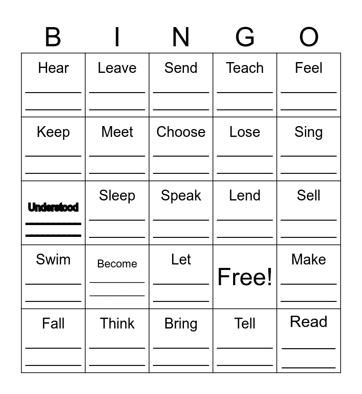 This bingo card has 25 words: Become _________ _________, Bring _______ _______, Choose _______ _______, Fall _______ _______, Feel _______ _______, Hear _______ _______, Keep _______ _______, Leave _______ _______, Lend _______ _______, Let _______ _______, Lose _______ _______, Understood __________ __________, Free!, Make _______ _______, Meet _______ _______, Read ______ ______, Sell _______ _______, Send _______ _______, Sing _______ _______, Sleep _______ _______, Speak _______ _______, Think _______ _______, Swim _______ _______, Teach _______ _______ and Tell _______ _______.