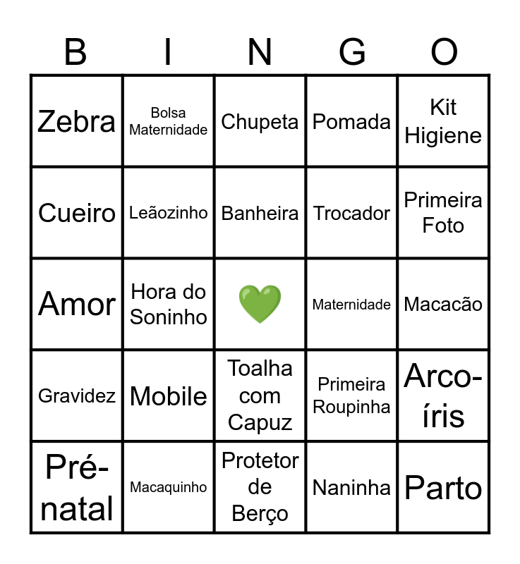 This bingo card has a free space and 80 words: Fralda, Mamadeira, Chupeta, Carrinho, Berço, Body, Sapatinho, Bebê Conforto, Naninha, Chocalho, Babador, Enxoval, Banheira, Pomada, Lenço Umedecido, Cueiro, Manta, Toalha com Capuz, Meia, Macacão, Almofada de Amamentação, Bolsa Maternidade, Protetor de Berço, Trocador, Kit Higiene, Termômetro, Aspirador Nasal, Prendedor de Chupeta, Cadeira de Alimentação, Mordedor, Gravidez, Ultrassom, Amamentação, Maternidade, Parto, Pré-natal, Contrações, Bolsa Estourou, Primeira Roupinha, Primeira Foto, Oliver, Safari, Leão, Girafa, Elefante, Zebra, Macaquinho, Hipopótamo, Rinoceronte, Tigre, Onça, Leãozinho, Girafinha, Elefantinho, Zebra Baby, Floresta, Selva, Natureza, Folhagem, Arco-íris, Amor, Colo, Soninho, Mamãe, Papai, Família, Carinho, Cheirinho de Bebê, Primeira Noite, Primeira Risada, Hora do Banho, Hora do Soninho, Hora da Papinha, Quartinho, Ursinho, Luz Noturna, Mobile, Música de Ninar, Cobertor and Aconchego.