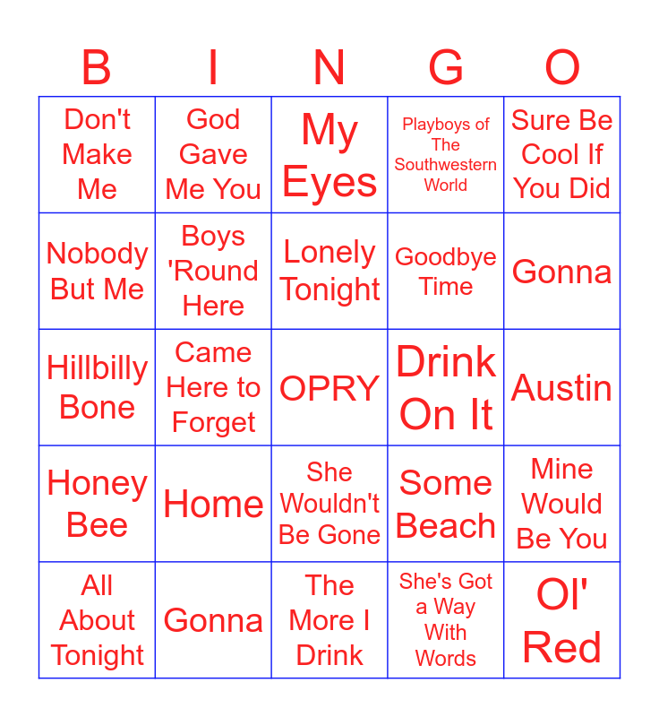 This bingo card has a free space and 32 words: She's Got a Way With Words, Sangria, Came Here to Forget, Go Ahead and Break My Heart, Honey Bee, Boys 'Round Here, Sure Be Cool If You Did, Mine Would Be You, God Gave Me You, Neon Light, Lonely Tonight, My Eyes, Doin' What She Likes, Over, Drink On It, Who Are You When I'm Not Looking, All About Tonight, Hillbilly Bone, She Wouldn't Be Gone, Home, Some Beach, The Baby, Austin, Gonna, Ol' Red, Playboys of The Southwestern World, Goodbye Time, Nobody But Me, Don't Make Me, The More I Drink, Home and Gonna.