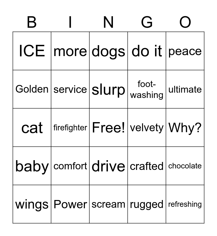 This bingo card has a free space and 29 words: wings, humility, firefighter, bespoke, ICE, dogs, service, comfort, velvety, Power, Why?, refreshing, scream, rugged, ultimate, BOLD, drive, baby, peace, cat, crafted, love, foot-washing, Golden, do it, more, chocolate, slurp and eagle.