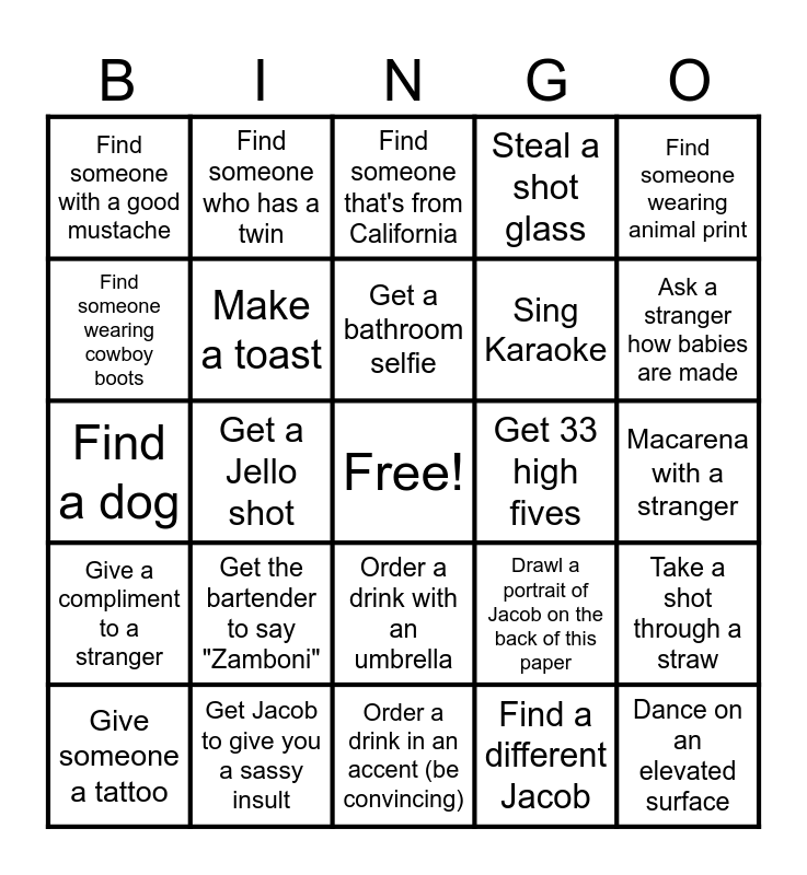 This bingo card has a free space and 29 words: Chug a water, Get Jacob to give you a sassy insult, Find someone that's from California, Order a drink you've never had, Find someone wearing animal print, Find someone with a good mustache, Make a toast, Get a bathroom selfie, Get 33 high fives, Take a shot through a straw, Give someone a tattoo, Get a Jello shot, Find a different Jacob, Dance on an elevated surface, Find a dog, find someone celebrating their birthday, Order a drink in an accent (be convincing), Drawl a portrait of Jacob on the back of this paper, Ask a stranger how babies are made, Give a compliment to a stranger, Get the bartender to say "Zamboni", Find someone who's from a different country, Sing Karaoke, Macarena with a stranger, Find someone wearing cowboy boots, Find someone who has a twin, Order a drink with an umbrella, Steal a shot glass and Find someone who has a big beard.