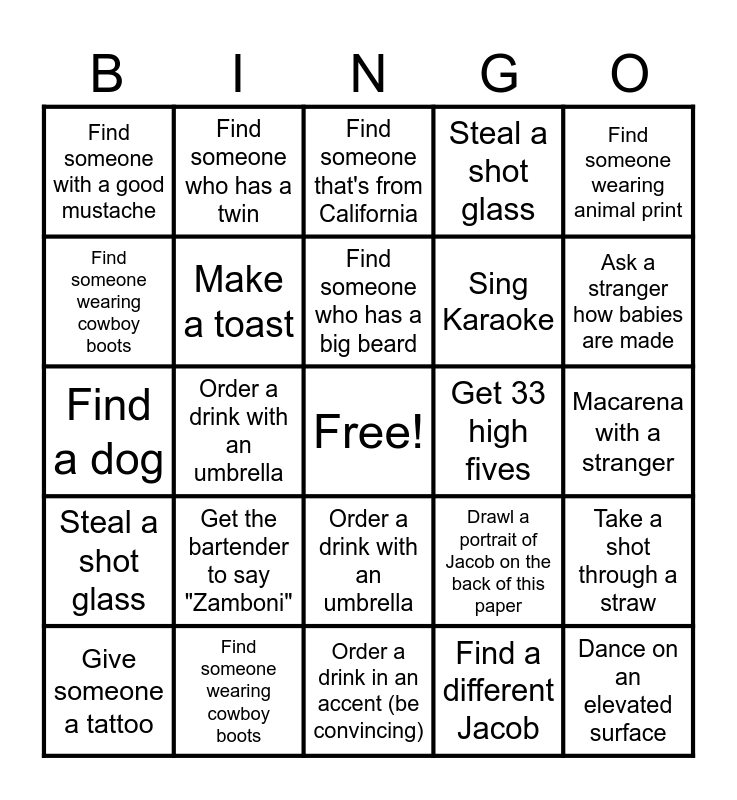 This bingo card has a free space and 29 words: Chug a water, Find someone wearing cowboy boots, Find someone that's from California, Order a drink you've never had, Find someone wearing animal print, Find someone with a good mustache, Make a toast, Find someone who has a big beard, Get 33 high fives, Take a shot through a straw, Give someone a tattoo, Order a drink with an umbrella, Find a different Jacob, Dance on an elevated surface, Find a dog, find someone celebrating their birthday, Order a drink in an accent (be convincing), Drawl a portrait of Jacob on the back of this paper, Ask a stranger how babies are made, Steal a shot glass, Get the bartender to say "Zamboni", Find someone who's from a different country, Sing Karaoke, Macarena with a stranger, Find someone wearing cowboy boots, Find someone who has a twin, Order a drink with an umbrella, Steal a shot glass and Find someone who has a big beard.