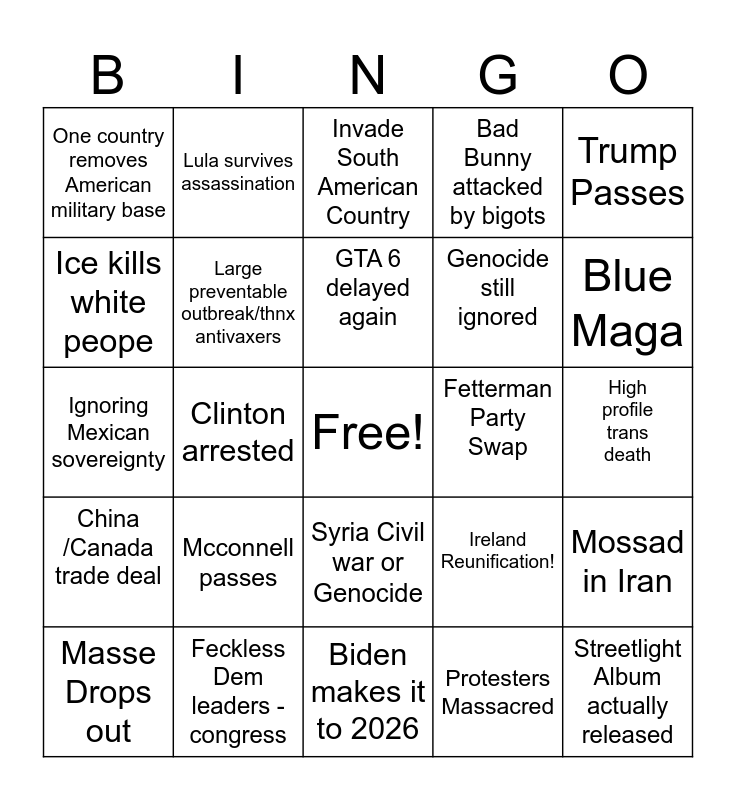 This bingo card has a free space and 24 words: Mcconnell passes, Feckless Dem leaders -congress, GTA 6 delayed again, Masse Drops out, Trump Passes, One country removes American military base, Ice kills white peope, Lula survives assassination, Fetterman Party Swap, Syria Civil war or Genocide, Genocide still ignored, Ignoring Mexican sovereignty, Ireland Reunification!, Mossad in Iran, Large preventable outbreak/thnx antivaxers, Protesters Massacred, High profile trans death, Invade South American Country, Blue Maga, Clinton arrested, Streetlight Album actually released, China /Canada trade deal, Bad Bunny attacked by bigots and Biden makes it to 2026.
