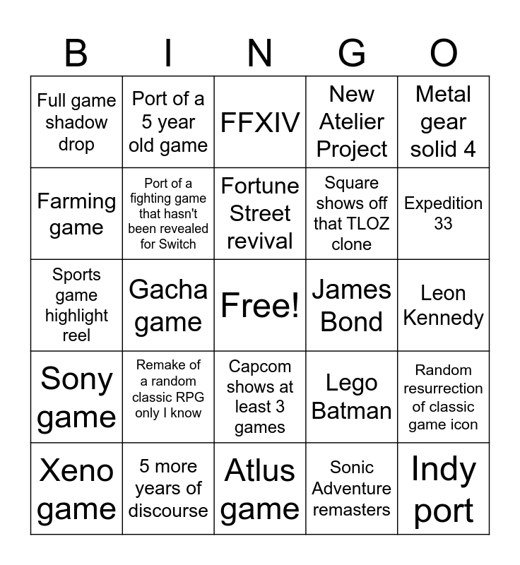 This bingo card has a free space and 24 words: Remake of a random classic RPG only I know, 5 more years of discourse, Fortune Street revival, Xeno game, Metal gear solid 4, Full game shadow drop, Farming game, Port of a 5 year old game, James Bond, Capcom shows at least 3 games, Square shows off that TLOZ clone, Sports game highlight reel, Lego Batman, Random resurrection of classic game icon, Port of a fighting game that hasn't been revealed for Switch, Sonic Adventure remasters, Leon Kennedy, FFXIV, Expedition 33, Gacha game, Indy port, Sony game, New Atelier Project and Atlus game.