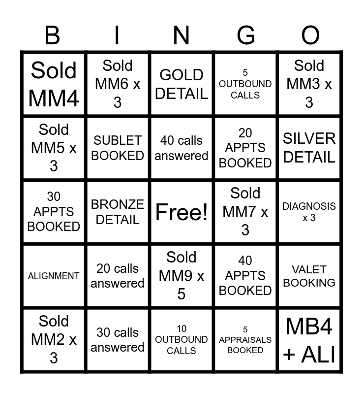 This bingo card has a free space and 24 words: 20 calls answered, 30 calls answered, 40 calls answered, Sold MM2 x 3, Sold MM3 x 3, Sold MM4, Sold MM5 x 3, Sold MM6 x 3, Sold MM7 x 3, Sold MM9 x 5, 20 APPTS BOOKED, 30 APPTS BOOKED, 40 APPTS BOOKED, VALET BOOKING, SUBLET BOOKED, 5 APPRAISALS BOOKED, DIAGNOSIS x 3, GOLD DETAIL, SILVER DETAIL, BRONZE DETAIL, MB4 + ALI, ALIGNMENT, 5 OUTBOUND CALLS and 10 OUTBOUND CALLS.