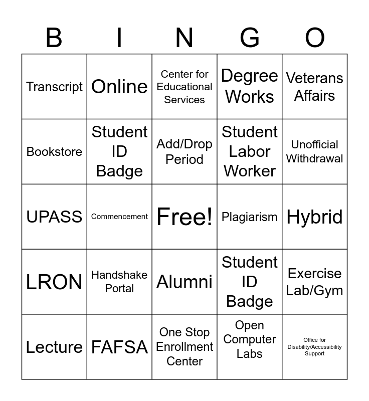 This bingo card has a free space and 29 words: Lecture, Prerequisite, Commencement, Campus Police/Public Safety, Transcript, Center for Educational Services, Student ID Badge, Handshake Portal, Plagiarism, FAFSA, Hybrid, Office for Disability/Accessibility Support, One Stop Enrollment Center, Open Computer Labs, Unofficial Withdrawal, Student Activities Office, Alumni, LRON, Veterans Affairs, UPASS, Student ID Badge, Final Exam Week, Student Labor Worker, Bookstore, Degree Works, Online, Exercise Lab/Gym, Add/Drop Period and Withdrawal Period.