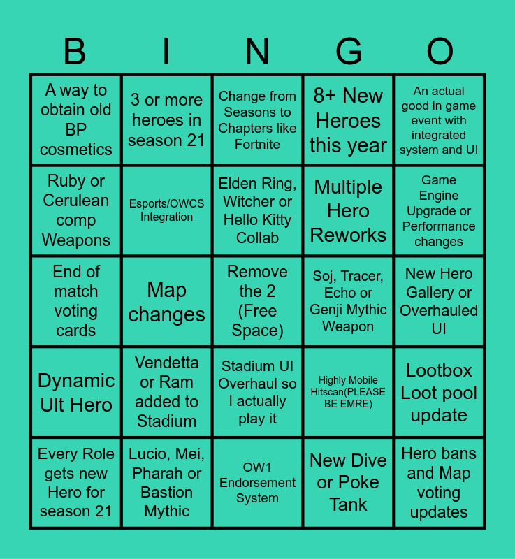 This bingo card has a free space and 24 words: Vendetta or Ram added to Stadium, Lucio, Mei, Pharah or Bastion Mythic, Elden Ring, Witcher or Hello Kitty Collab, Every Role gets new Hero for season 21, An actual good in game event with integrated system and UI, A way to obtain old BP cosmetics, Ruby or Cerulean comp Weapons, 3 or more heroes in season 21, Soj, Tracer, Echo or Genji Mythic Weapon, Stadium UI Overhaul so I actually play it, Multiple Hero Reworks, End of match voting cards, Highly Mobile Hitscan(PLEASE BE EMRE), Lootbox Loot pool update, Esports/OWCS Integration, New Dive or Poke Tank, New Hero Gallery or Overhauled UI, Change from Seasons to Chapters like Fortnite, Game Engine Upgrade or Performance changes, Map changes, Hero bans and Map voting updates, Dynamic Ult Hero, 8+ New Heroes this year and OW1 Endorsement System.
