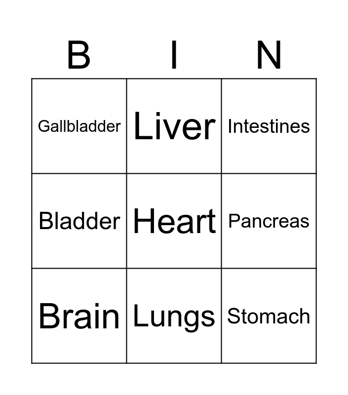 This bingo card has a free space and 11 words: Esophagus, Lungs, Stomach, Brain, Liver, Intestines, Pancreas, Kidneys, Bladder, Gallbladder and Spleen.