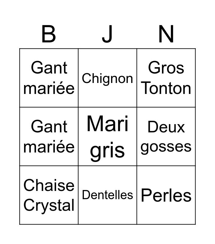 This bingo card has a free space and 11 words: Gant mariée, Dentelles, Perles, Chaise Crystal, Chignon, Gros Tonton, Deux gosses, Rose blanches, Gant mariée, Gant mariée and Gant mariée.