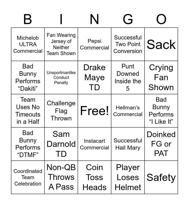 This bingo card has a free space and 37 words: Interception, Fumble, Holding Penalty, Unsportmanlike Conduct Penalty, Doinked FG or PAT, Sam Darnold TD, Drake Maye TD, Jaxon Smith-Njigba TD, Sack, TreVeyon Henderson TD, Challenge Flag Thrown, Successful Two Point Conversion, Safety, Bad Bunny Performs “I Like It”, Bad Bunny Performs “Dakiti”, Bad Bunny Performs “DTMF”, Blocked Kick, Pepsi Commercial, Instacart Commercial, Hellman’s Commercial, Michelob ULTRA Commercial, Crying Fan Shown, Coordinated Team Celebration, Coin Toss Heads, Coin Toss Tails, Player Loses Helmet, Fan Wearing Jersey of Neither Team Shown, Cris Collinsworth Says “Now Here’s a Guy…”, Tom Brady Shown, Bill Belichick Shown, Any Member of the Legion of Boom Shown, Non-QB Throws A Pass, Team Uses No Timeouts in a Half, Successful 50+ Yard FG, Successful Hail Mary, Punt Downed Inside the 5 and TD Scored by D/ST.