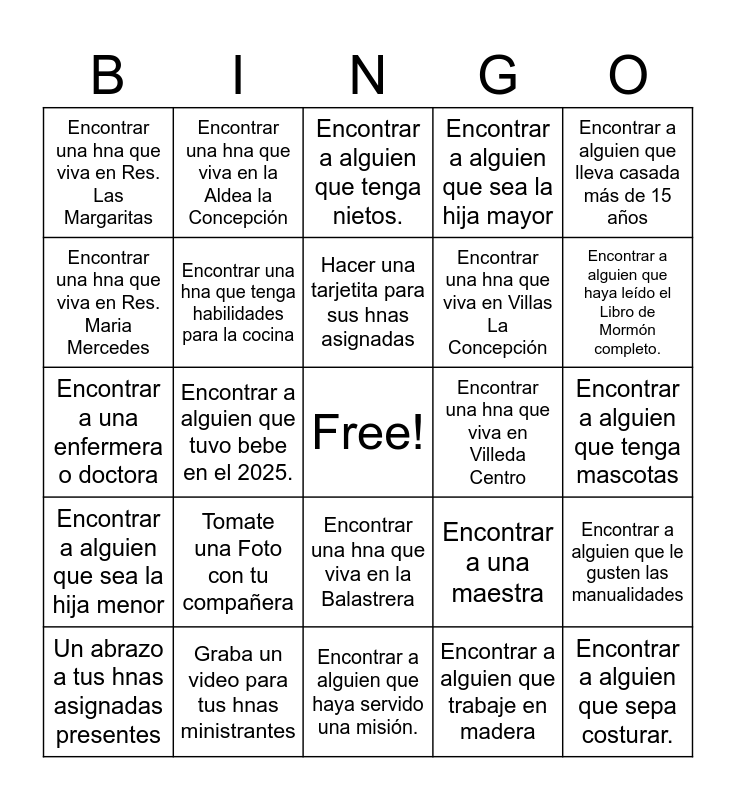This bingo card has a free space and 24 words: Tomate una Foto con tu compañera, Graba un video para tus hnas ministrantes, Hacer una tarjetita para sus hnas asignadas, Un abrazo a tus hnas asignadas presentes, Encontrar a alguien que lleva casada más de 15 años, Encontrar una hna que viva en Res. Las Margaritas, Encontrar una hna que viva en Res. Maria Mercedes, Encontrar una hna que viva en la Aldea la Concepción, Encontrar una hna que viva en Villeda Centro, Encontrar una hna que viva en la Balastrera, Encontrar una hna que viva en Villas La Concepción, Encontrar a una enfermera o doctora, Encontrar a una maestra, Encontrar a alguien que le gusten las manualidades, Encontrar una hna que tenga habilidades para la cocina, Encontrar a alguien que trabaje en madera, Encontrar a alguien que tenga mascotas, Encontrar a alguien que tenga nietos., Encontrar a alguien que haya leído el Libro de Mormón completo., Encontrar a alguien que tuvo bebe en el 2025., Encontrar a alguien que sepa costurar., Encontrar a alguien que sea la hija menor, Encontrar a alguien que sea la hija mayor and Encontrar a alguien que haya servido una misión..