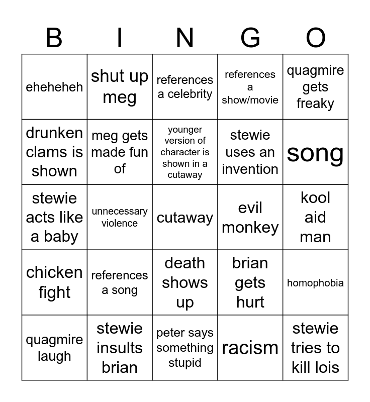 This bingo card has a free space and 24 words: references a song, stewie insults brian, younger version of character is shown in a cutaway, quagmire laugh, quagmire gets freaky, eheheheh, drunken clams is shown, shut up meg, evil monkey, death shows up, stewie uses an invention, stewie acts like a baby, brian gets hurt, homophobia, meg gets made fun of, racism, kool aid man, references a celebrity, song, unnecessary violence, stewie tries to kill lois, chicken fight, references a show/movie and peter says something stupid.