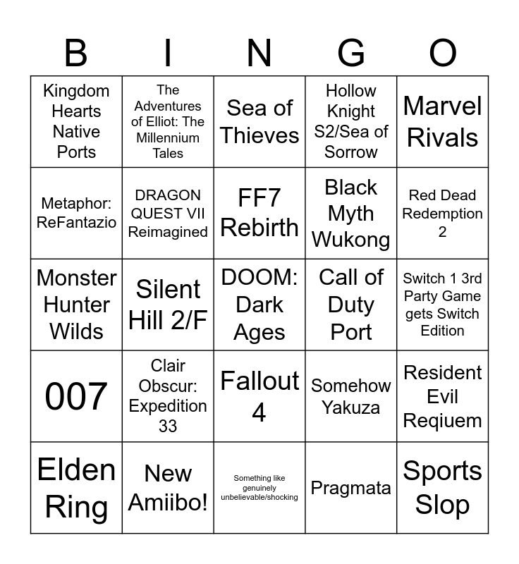 This bingo card has a free space and 24 words: Clair Obscur: Expedition 33, New Amiibo!, FF7 Rebirth, Elden Ring, Marvel Rivals, Kingdom Hearts Native Ports, Metaphor: ReFantazio, The Adventures of Elliot: The Millennium Tales, Call of Duty Port, Fallout 4, Black Myth Wukong, Monster Hunter Wilds, Somehow Yakuza, Resident Evil Reqiuem, DRAGON QUEST VII Reimagined, Pragmata, Switch 1 3rd Party Game gets Switch Edition, Sea of Thieves, Red Dead Redemption 2, Silent Hill 2/F, Sports Slop, 007, Hollow Knight S2/Sea of Sorrow and Something like genuinely unbelievable/shocking.