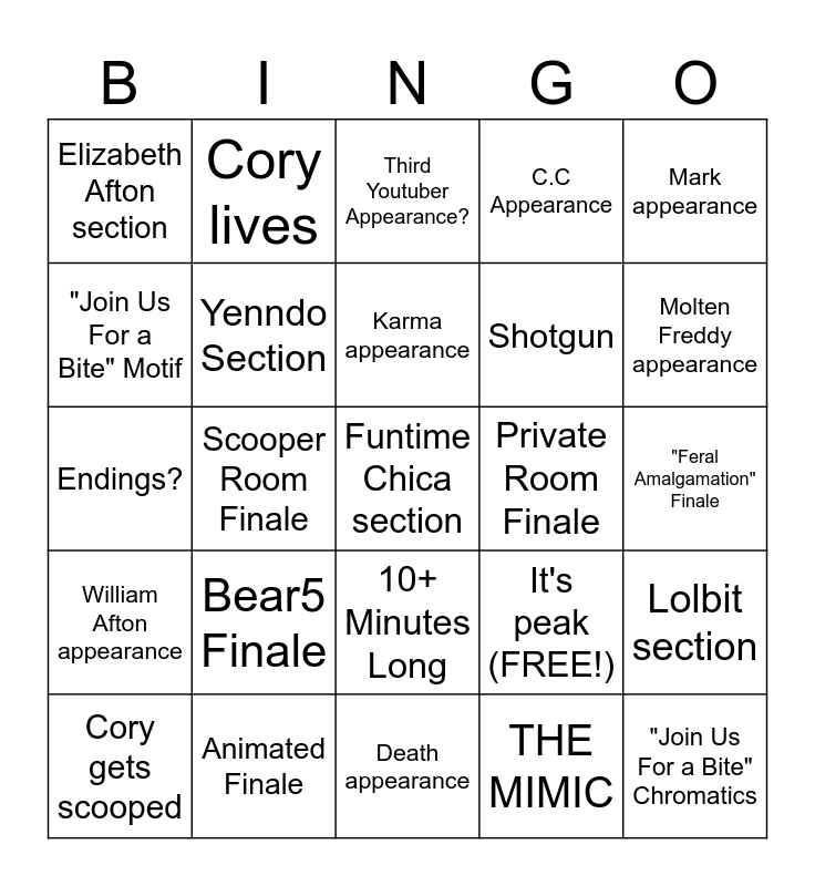 This bingo card has 25 words: Bear5 Finale, Death appearance, Karma appearance, Cory gets scooped, Mark appearance, Elizabeth Afton section, "Join Us For a Bite" Motif, Cory lives, Private Room Finale, 10+ Minutes Long, Shotgun, Endings?, It's peak (FREE!), Lolbit section, Yenndo Section, "Join Us For a Bite" Chromatics, "Feral Amalgamation" Finale, Third Youtuber Appearance?, Molten Freddy appearance, Scooper Room Finale, Funtime Chica section, Animated Finale, William Afton appearance, C.C Appearance and THE MIMIC.