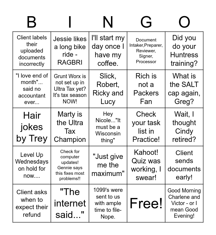 This bingo card has 30 words: "The internet said...", One Big Beautiful Bill, Marty is the Ultra Tax Champion, IRS not accepting paper checks??, Client labels their uploaded documents incorrectly, I'll start my day once I have my coffee., Grunt Worx is not set up in Ultra Tax yet? It's tax season NOW!, "Just give me the maximum", Check your task list in Practice!, 1099's were sent to us with ample time to file-Nope., Wait, I thought Cindy retired?, Hey Nicole..."It must be a Wisconsin thing", Free!, Good Morning Charlene and Victor - or I mean Good Evening!, What is the SALT cap again, Greg?, *sigh* Have to send a missing document email..., Kahoot! Quiz was working, I swear!, Level Up Wednesdays on hold for now...., Check for computer updates! Gennie says this fixes most problems!!, Did you do your Huntress training?, Hair jokes by Trey, Did we establish if beavers use tools?, Jessie likes a long bike ride - RAGBRI, Rich is not a Packers Fan, "I love end of month"... said no accountant ever..., Document Intaker,Preparer, Reviewer, Signer, Processor, Client sends documents early!, Client asks when to expect their refund, Slick, Robert, Ricky and Lucy and Stewie awaits his half/half creamer "pup cup" from Gennie.