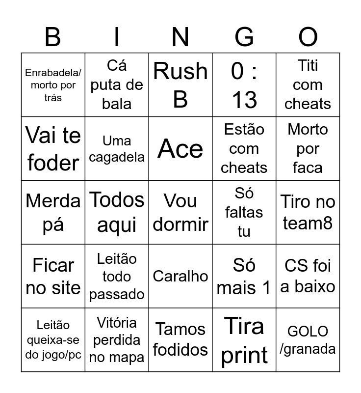 This bingo card has a free space and 24 words: Leitão todo passado, Vitória perdida no mapa, Ace, Leitão queixa-se do jogo/pc, Titi com cheats, Enrabadela/ morto por trás, Vai te foder, Cá puta de bala, Só faltas tu, Caralho, Estão com cheats, Merda pá, Só mais 1, CS foi a baixo, Uma cagadela, Tira print, Tiro no team8, Rush B, Morto por faca, Todos aqui, GOLO /granada, Ficar no site, 0 : 13 and Tamos fodidos.