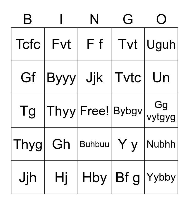 This bingo card has a free space and 24 words: Gh, Hj, Jjk, Jjh, Uguh, Tcfc, Gf, Fvt, Bybgv, Buhbuu, Tvtc, Tg, Y y, Nubhh, Byyy, Bf g, Gg vytgyg, F f, Un, Thyy, Yybby, Thyg, Tvt and Hby.