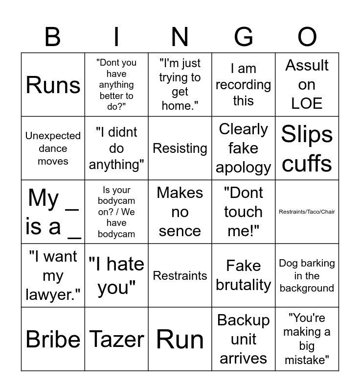 This bingo card has 40 words: "I cant Breathe", My _ is a _, Goat Screams, "I didnt do anything", Tazer, Restraints, Resisting, Drunk by denys drinking, Assult on LOE, "I want my lawyer.", Is your bodycam on? / We have bodycam, I am recording this, Makes no sence, Restraints/Taco/Chair, "Dont touch me!", "I hate you", "I love you", Runs, Kicks, "I'm just trying to get home.", Dog barking in the background, Backup unit arrives, Clearly fake apology, Unexpected dance moves, "I know my rights!", flirt with the officer, Do you know who I am?", "Can I speak to your supervisor?", "You're making a big mistake", Attempt to flee, Crying, Bribe, "Your hurting me!", Fake brutality, Slips cuffs, Run, "I am recording you", "This is ridiculous!", "Dont you have anything better to do?" and An unexpected burst of song or humming.