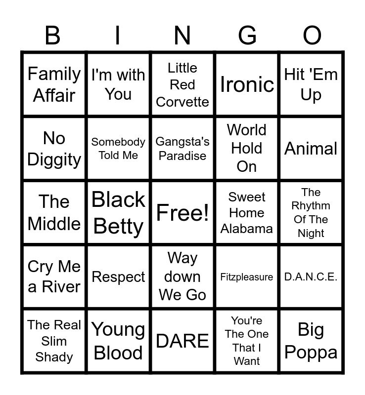 This bingo card has a free space and 75 words: Don't Wanna Fight, Lose Control, Little Red Corvette, Where Is My Mind?, Funkytown, Smalltown Boy, Get Up Offa That Thing, Praise You, Daddy Cool, Dancing in the Moonlight, Sugar Man, Dirty Work, Gangsta's Paradise, No Diggity, Jump Around, Black Betty, Intergalactic, Big Poppa, Hate It Or Love It, Hit 'Em Up, Apologize, The Middle, Somebody Told Me, I'm with You, Ironic, Come As You Are, Blister In The Sun, Walkin' On The Sun, Should I Stay or Should I Go, Chop Suey!, Closing Time, Hella Good, Take Your Mama, Fitzpleasure, Animal, World Hold On, It Wasn't Me, Blinding Lights, The Rhythm Of The Night, You're The One That I Want, Bust A Move, Bennie And The Jets, Here Comes The Sun, Hurricane, Superstition, Every Breath You Take, The Real Slim Shady, Family Affair, I Know What You Want, Work Out, Radioactive, Way down We Go, Don't Let Me Down, Sail, Dilemma, Superstar, Get Low, 1, 2 Step, Jailhouse Rock, (What A) Wonderful World, Respect, I Want To Hold Your Hand, What A Wonderful World, Somebody To Love, My Girl, Sweet Home Alabama, Sugar, Sugar, Memories, Around the World, D.A.N.C.E., Cry Me a River, Young Blood, Holiday, DARE and Dance Yrself Clean.