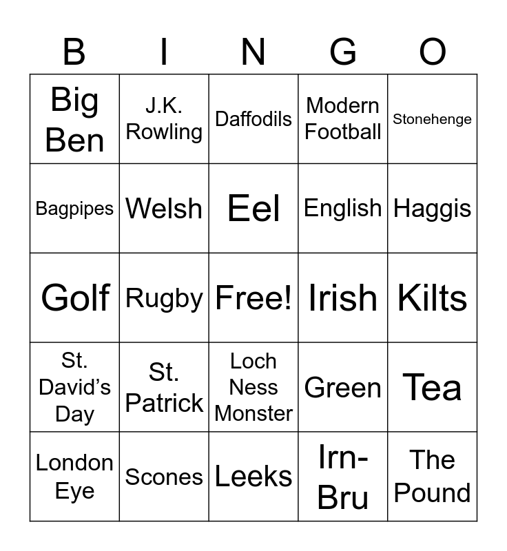 This bingo card has a free space and 24 words: St. Patrick, Scones, Eel, London Eye, Stonehenge, Big Ben, Bagpipes, J.K. Rowling, Irish, Loch Ness Monster, English, Golf, Green, Tea, Welsh, Irn-Bru, Kilts, Daffodils, Haggis, Rugby, The Pound, St. David’s Day, Modern Football and Leeks.