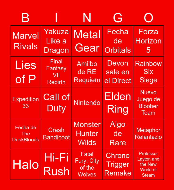 This bingo card has a free space and 24 words: Crash Bandicoot, Hi-Fi Rush, Amiibo de RE Requiem, Halo, Forza Horizon 5, Marvel Rivals, Lies of P, Yakuza Like a Dragon, Elden Ring, Monster Hunter Wilds, Devon sale en el Direct, Expedition 33, Algo de Rare, Metaphor Refantazio, Final Fantasy VII Rebirth, Chrono Trigger Remake, Nuevo Juego de Bloober Team, Metal Gear, Rainbow Six Siege, Call of Duty, Professor Layton and the New World of Steam, Fecha de The DuskBloods, Fecha de Orbitals and Fatal Fury: City of the Wolves.