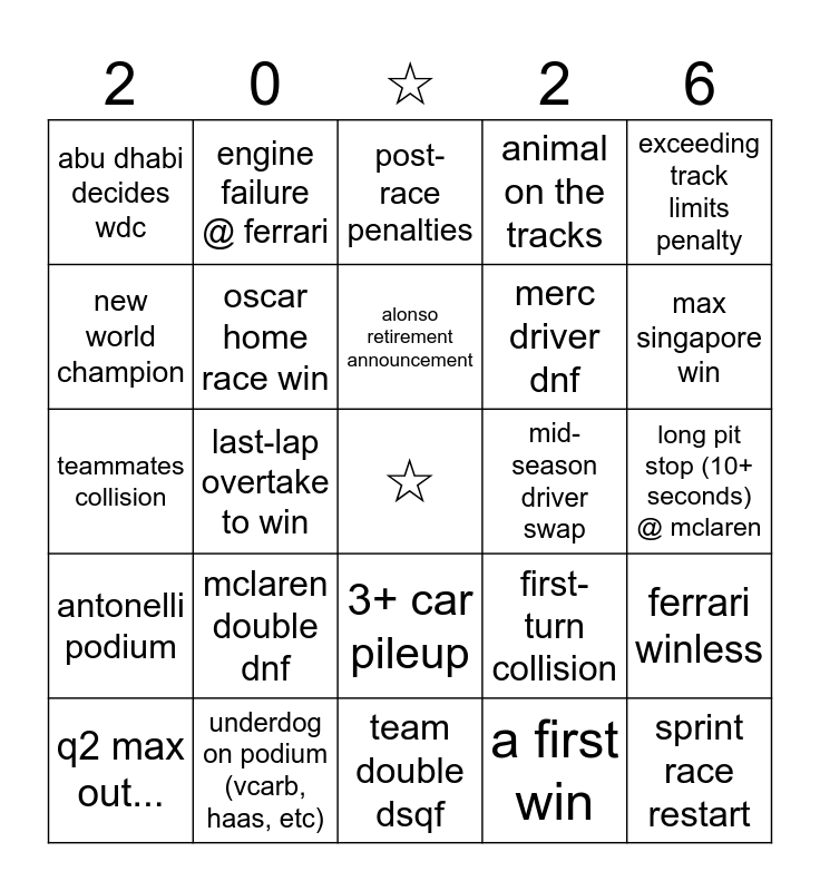This bingo card has a free space and 24 words: mclaren double dnf, underdog on podium (vcarb, haas, etc), alonso retirement announcement, q2 max out..., exceeding track limits penalty, abu dhabi decides wdc, new world champion, engine failure @ ferrari, mid-season driver swap, 3+ car pileup, merc driver dnf, teammates collision, first-turn collision, ferrari winless, oscar home race win, a first win, long pit stop (10+ seconds) @ mclaren, post-race penalties, max singapore win, last-lap overtake to win, sprint race restart, antonelli podium, animal on the tracks and team double dsqf.