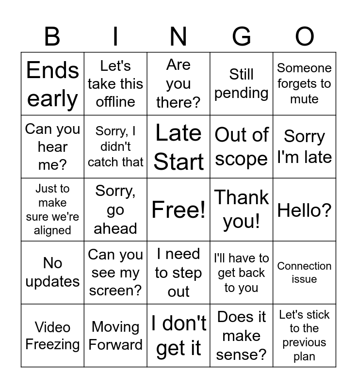 This bingo card has a free space and 24 words: Can you see my screen?, Moving Forward, Late Start, Video Freezing, Someone forgets to mute, Ends early, Can you hear me?, Let's take this offline, Thank you!, I need to step out, Out of scope, Just to make sure we're aligned, I'll have to get back to you, Connection issue, Sorry, I didn't catch that, Does it make sense?, Hello?, Are you there?, Sorry I'm late, Sorry, go ahead, Let's stick to the previous plan, No updates, Still pending and I don't get it.