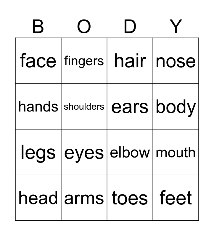 This bingo card has 17 words: toes, head, hair, face, eyes, nose, mouth, ears, body, shoulders, arms, elbow, hands, fingers, legs, knees and feet.